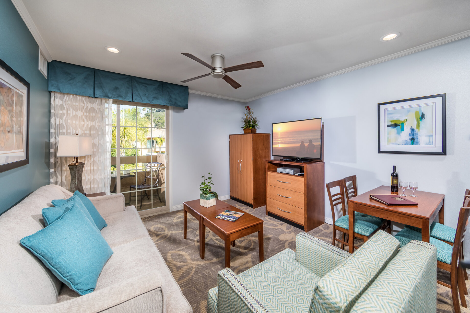 The Studio room is your perfect coastal retreat, featuring a cozy queen-size bed, a chic seating area, and a fully equipped kitchenette. Unwind in the soothing blue tones and modern furnishings that create a serene, inviting atmosphere. Make yourself at home as you relax, cook, and enjoy the ultimate comfort in this peaceful space.
